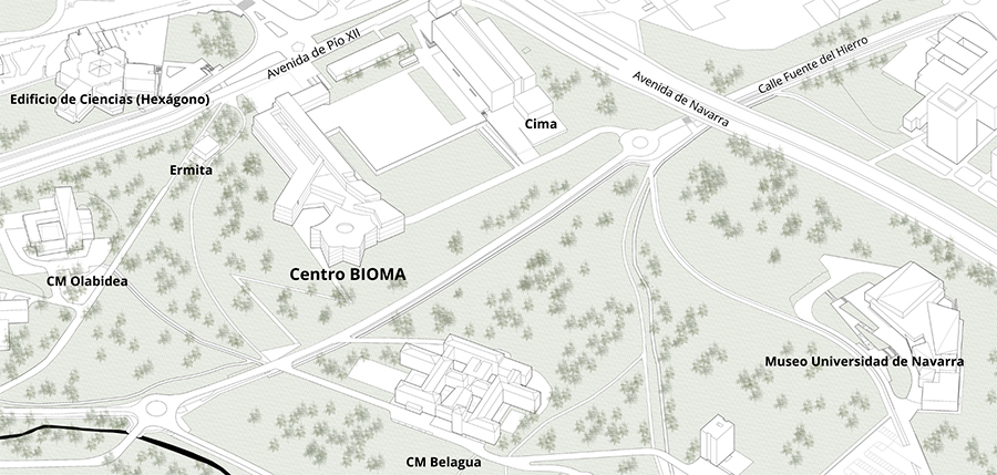 The BIOMA Centre will be built in the area of the Cimaagainst the University of Navarra Clinicacting as a link between the campus and the city of Pamplona. It will have 13,000 square metresOf these, 3,600 square metres will be used for teaching; 2,800 square metres for research; and a further 4,400 square metres for the exhibition area. Access to the building will be via a new pedestrian plaza, giving direct access to a service area: the reception, a shop, a restaurant area and versatile spaces for representation and meetings with companies, institutions and other external entities.