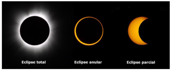 ∅Total: when the Moon completely covers the solar disk. Day turns into night. The temperature drops, the stars come out, animals become confused, and the solar corona (the Sun's outer atmosphere) becomes visible. It is a breathtaking and very brief spectacle: it lasts only a few minutes and is only visible at a specific point on Earth.