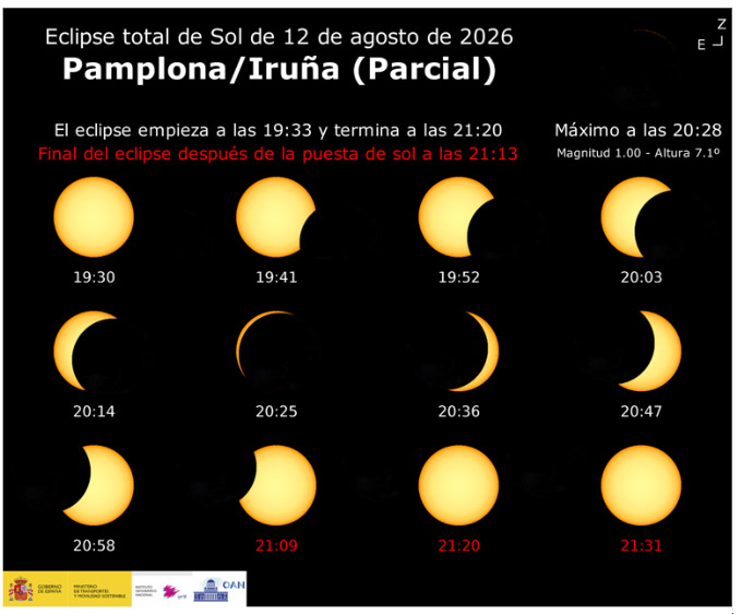 Yes, if the sky is clear. In Pamplona, a partial eclipse will be visible, beginning at 7:33 p.m. and ending at 9:13 p.m., with maximum visibility at 8:28 p.m. The further south we travel in Navarre, the better it will be seen.